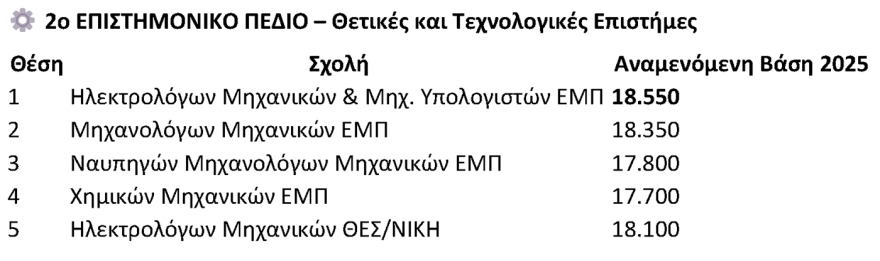 Οι top 5 σχολές ανά επιστημονικό πεδίο βάσει της αναμενόμενης βάσης 2025, με έμφαση στις υψηλόβαθμες επιλογές, είναι οι ακόλουθες: