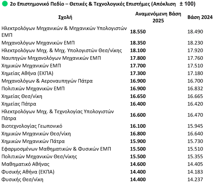 Στο δεύτερο Πεδίο των Θετικών Επιστημών, η Χημεία δίνει μικρότερες βαθμολογίες αλλά τα θέματα της Φυσικής και των Μαθηματικών βοήθησαν τους υποψηφίους να έχουν καλύτερες βαθμολογίες, με τελικό αποτέλεσμα οι βάσεις να αυξάνονται λίγο στις περιζήτητες σχολές, με μικρές διακυμάνσεις στις μεσαίες, ενώ οι σχολές χαμηλής ζήτησης θα παραμείνουν στα ίδια επίπεδα.