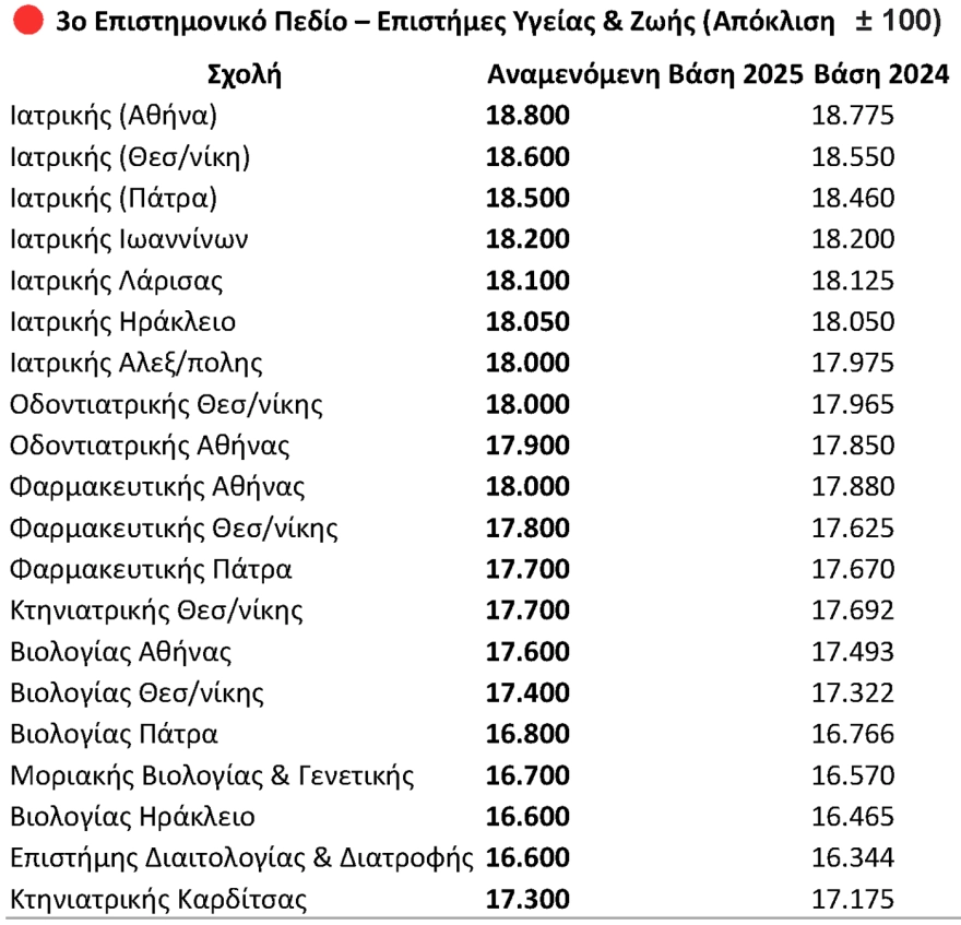 Στο τρίτο πεδίο των Επιστημών Υγείας και Ζωής, τα δυσκολότερα θέματα, που δόθηκαν στο μάθημα της Βιολογίας, το οποίο είναι και μάθημα αυξημένης βαρύτητας αλλά και η Χημεία με τις χαμηλότερες βαθμολογίες, θα ωθήσουν τις βάσεις ελαφρώς προς τα κάτω, επειδή τη μεγαλύτερη πτώση τη συγκρατούν οι καλύτερες βαθμολογίες στο μάθημα της Φυσικής. Στις υψηλόβαθμες σχολές, όπως οι Ιατρικές αναμένουμε μικρή πτώση μέχρι και 100 μόρια περίπου ενώ στις υπόλοιπες θα δούμε μικρές αυξομειώσεις.