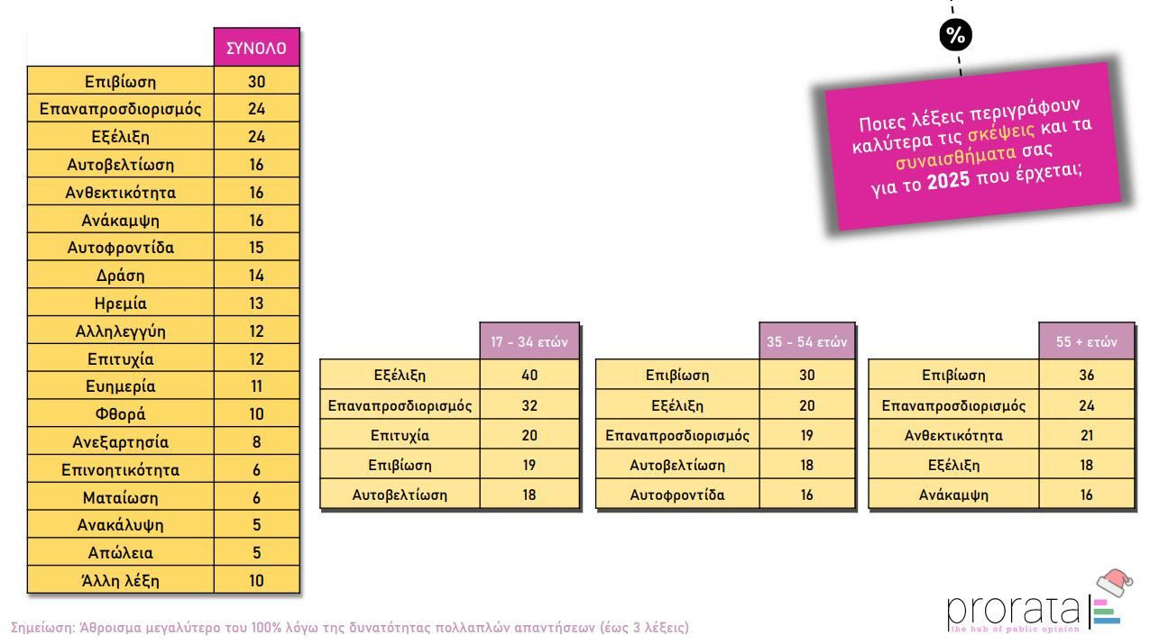 Ελλείψει άλλων στατιστικών για το ποιες προσωπικές αποφάσεις θα πάρουν οι Έλληνες για το 2025, η σημερινή δημοσκόπηση της Prorata για τις λέξεις της χρονιάς, δίνει μια πρόγευση: