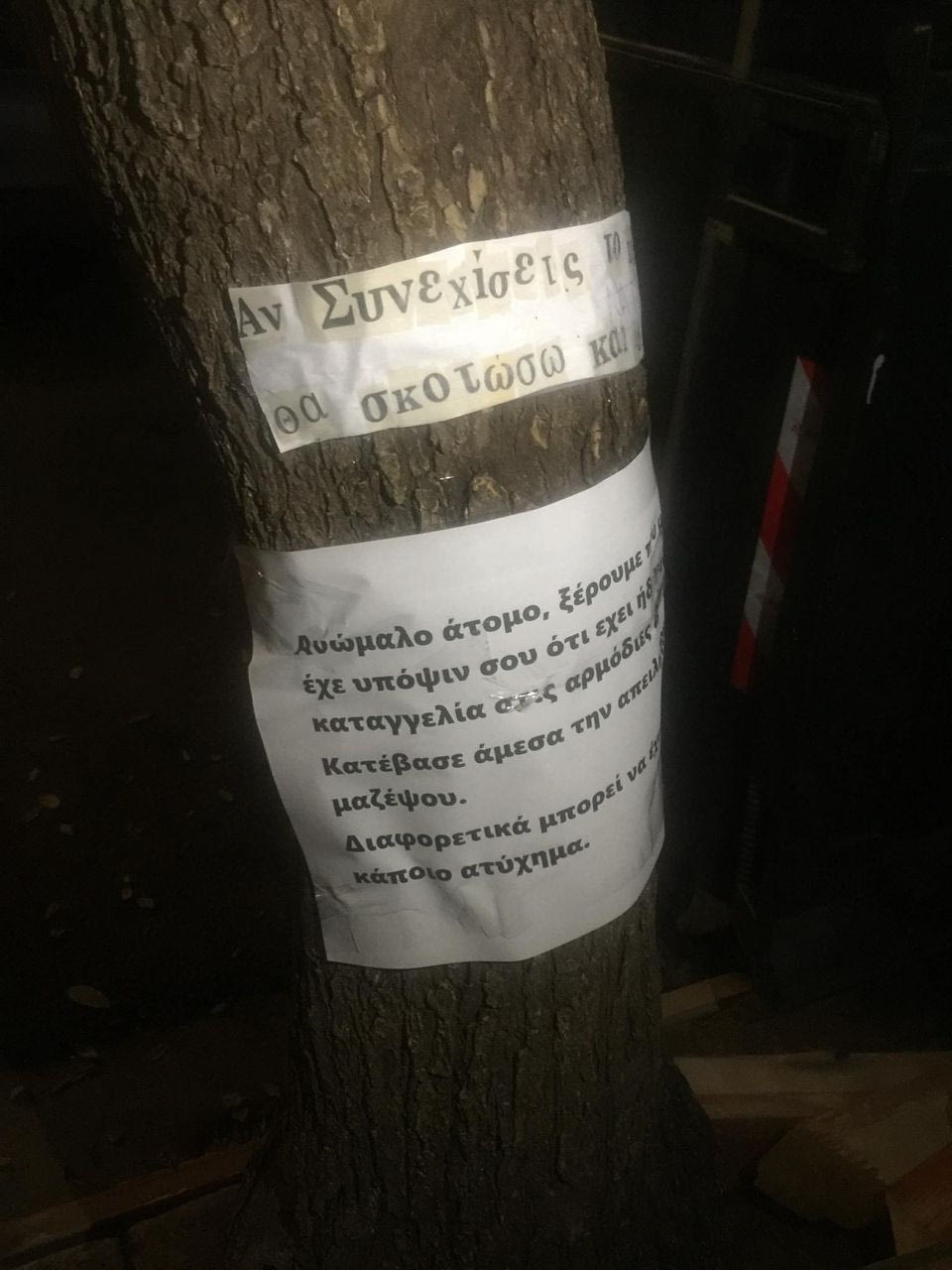 «Το ΤΕΡΑΣ άφησε απειλητικό σημείωμα κολλημένο στο δέντρο πάνω από το άψυχο κορμί της γάτας με το οποίο απειλεί ότι θα ξανασκοτώσει. Το σημείωμα, είναι φτιαγμένο με γράμματα εφημερίδας» αναφέρει η εθελόντρια.