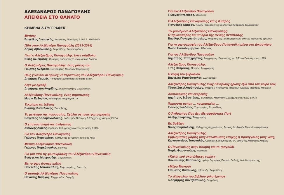 – Τριάντα ένα (31) κείμενα ιστορικών, συγγραφέων, ποιητών, σκηνοθετών, καθηγητών, δημοσιογράφων, μουσικών, ηθοποιών, που αναφέρονται τόσο στην πολιτική διάσταση της προσφοράς και τον ηρωισμό του Α. Παναγούλη, όσο και στο ποιητικό του έργο