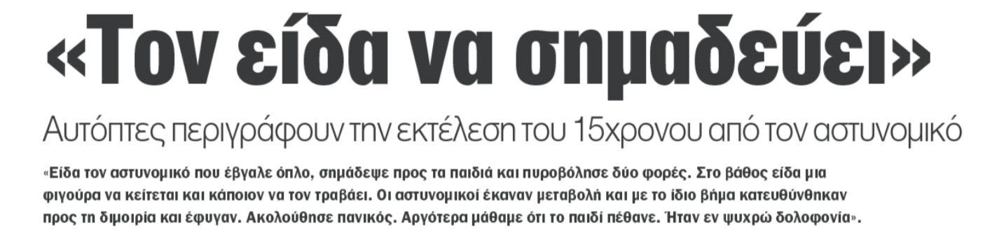»Αυτόπτης μάρτυρας στην εν ψυχρώ εκτέλεση ενός 15χρονου παιδιού «της διπλανής πόρτας», του Αλέξη Γρηγορόπουλου, ήταν ο κ. Νώντας Παπαδημητρίου μαζί με δεκάδες άλλους θαμώνες καφετεριών και περαστικών από την περιοχή των Εξαρχείων το βράδυ του Σαββάτου. Οι περιγραφές των μαρτύρων ανατρέπουν τους ισχυρισμούς των δύο ειδικών φρουρών ότι δέχθηκαν επίθεση από τους νεαρούς και πυροβόλησαν πάνω σε συμπλοκή.