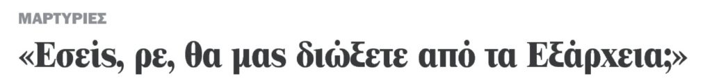 »Σύμφωνα με όσα αναφέρουν, ένας από τους δύο ειδικούς φρουρούς που επέβαιναν στο περιπολικό αποβιβάστηκε από το όχημα και απευθυνόμενος προς την παρέα τους είπε: “Εσείς, ρε θα μας διώξετε από τα Εξάρχεια;”, χρησιμοποιώντας παράλληλα και υβριστικές λέξεις.