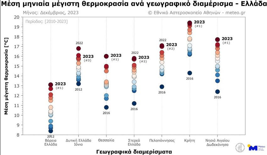 Στη Θεσσαλία ο Δεκέμβριος του 2023 ήταν κατά 1.1 °C θερμότερος από τον αντίστοιχο του 2022, τον αμέσως προήγουμενο θερμότερο Δεκέμβρη από το 2010.