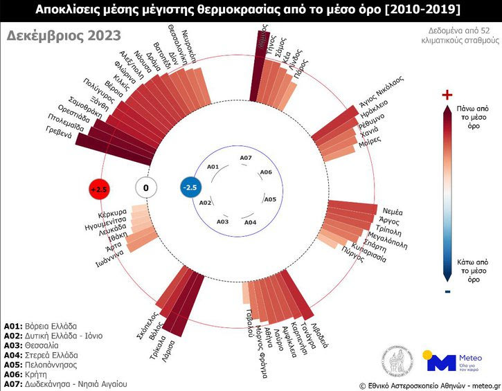 Ο χάρτης δείχνει τις αποκλίσεις της μέσης μέγιστης θερμοκρασίας τον Δεκέμβριο 2023 ανά γεωγραφικό διαμέρισμα.