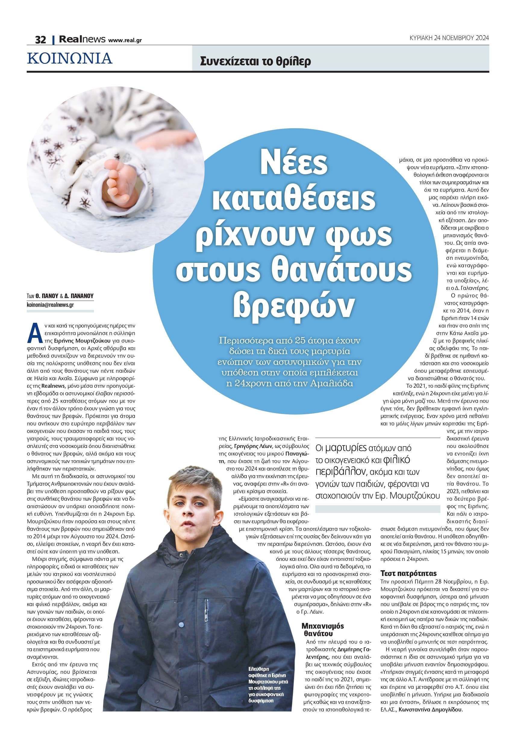 Εκτός από την έρευνα της Αστυνομίας, που βρίσκεται σε εξέλιξη, ιδιώτες ιατροδικαστές έχουν αναλάβει να συνεισφέρουν με τις γνώσεις τους στην υπόθεση των νεκρών βρεφών. Ο πρόεδρος της Ελληνικής Ιατροδικαστικής Εταιρείας, Γρηγόρης Λέων, ως σύμβουλος της οικογένειας του μικρού Παναγιώτη, που έχασε τη ζωή του τον Αύγουστο του 2024 και αποτέλεσε τη θρυαλλίδα για την εκκίνηση της έρευνας, αναφέρει στην «R» ότι αναμένει κρίσιμα στοιχεία.