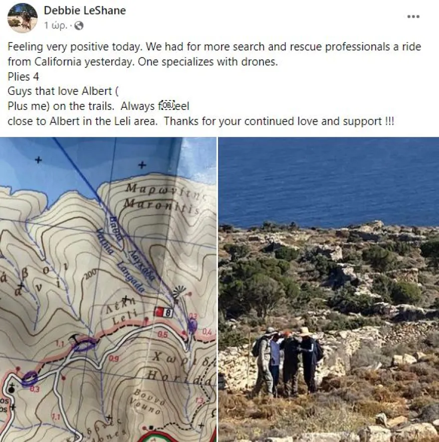 Όπως ανέφερε η σύντροφός του, Ντέμπι Λεσέιν, σε ανάρτησή σε ομάδα του νησιού, οι έρευνες συνεχίζονται με τη συνδρομή ειδικών από την Καλιφόρνια που ασχολούνται με drones.