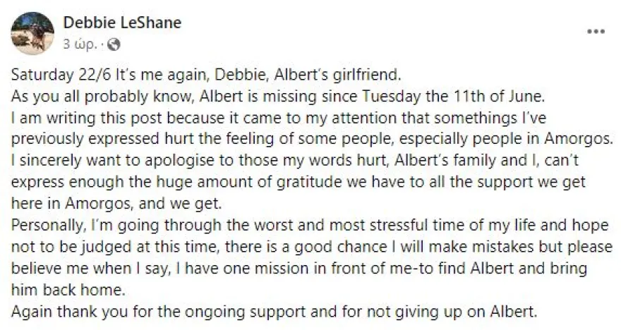«Γράφω αυτή την ανάρτηση γιατί διαπίστωσα πως ορισμένα πράγματα που είχα πει παλαιότερα πλήγωσαν τα αισθήματα ορισμένων ανθρώπων, ειδικά στην Αμοργό. Θέλω πραγματικά να απολογηθώ σε όσους πλήγωσα με τα λόγια μου. Η οικογένεια του Άλμπερτ και εγώ δεν μπορούμε να εκφράσουμε την τεράστια ευγνωμοσύνη που νιώθουμε για τη στήριξη που πήραμε εδώ στην Αμοργό. Εγώ προσωπικά περνάω τη χειρότερη περίοδο της ζωής μου και ελπίζω να μην με κρίνετε για όσα λέω. Υπάρχει περίπτωση να κάνω λάθη αλλά παρακαλώ πιστέψτε με όταν λέω ότι έχω μια αποστολή μπροστά μου, να βρω τον Άλμπερτ και να τον φέρω πίσω στο σπίτι του».