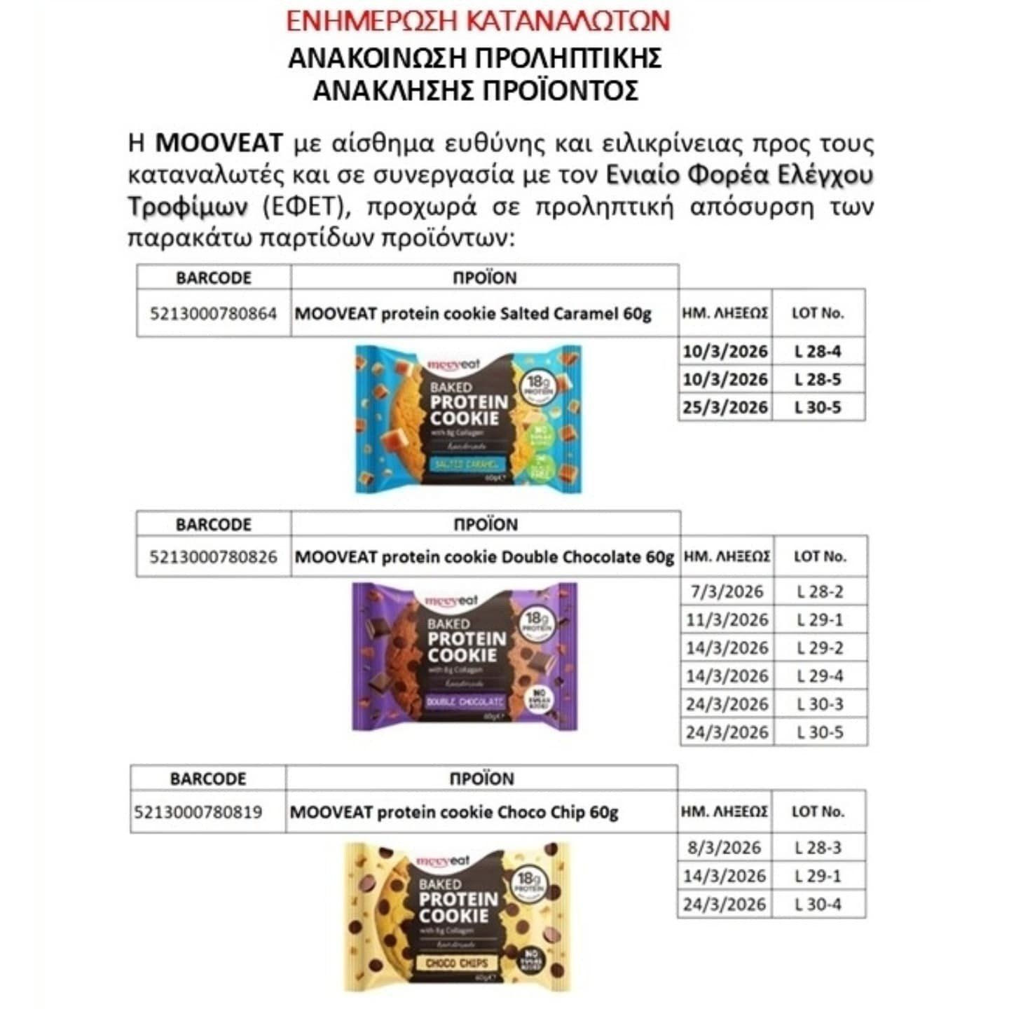 Με ανακοίνωση που εξέδωσε η εταιρεία MOOVeat και κατόπιν σχετική προειδοποίησης που αναρτήθηκε στο Ευρωπαϊκό Σύστημα Ταχείας ειδοποίησης για επικίνδυνα τρόφιμα RASFF (Rapid Alert System for Food and Feed) ανακλήθηκαν γνωστά μπισκότα πρωτεΐνης από την ελληνική αγορά, λόγω εμφάνισης μούχλας.