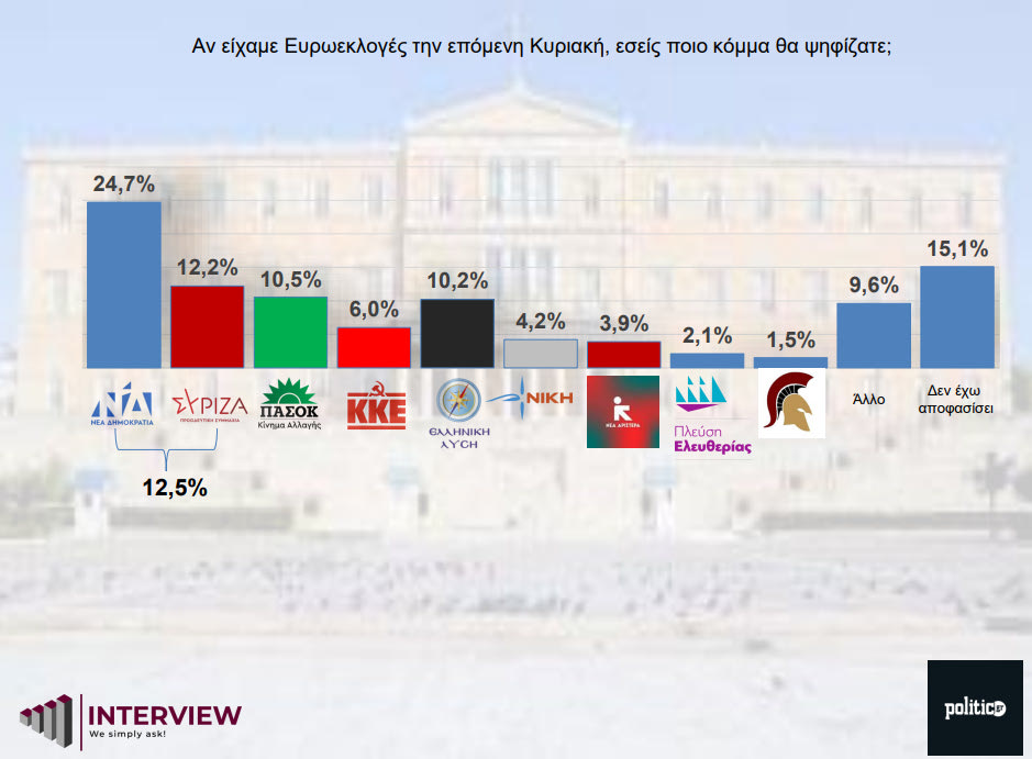 Στην ερώτηση «αν είχαμε Ευρωεκλογές την επόμενη Κυριακή, εσείς ποιο κόμμα θα ψηφίζατε», η ΝΔ είναι ξανά πρώτο κόμμα, με 24,7%: