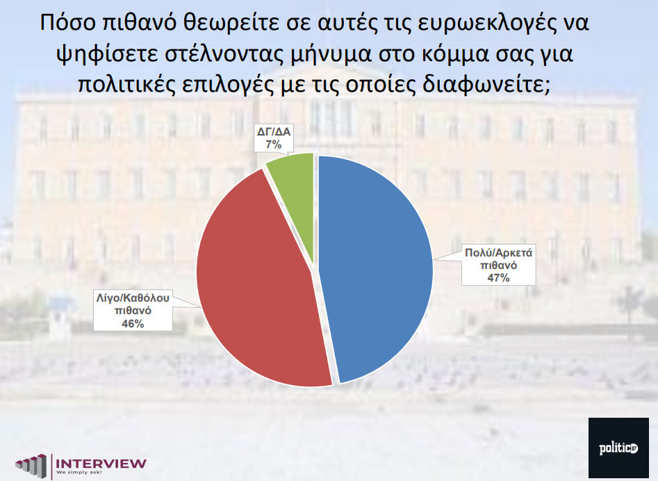 Παράλληλα, το 47% θεωρεί «πολύ/αρκετά πιθανό» να ψηφίσει για να στείλει μήνυμα στο κόμμα του για τις πολιτικές επιλογές με τις οποίες διαφωνεί, ενώ το 46% δηλώνει «λίγο/καθόλου πιθανό».