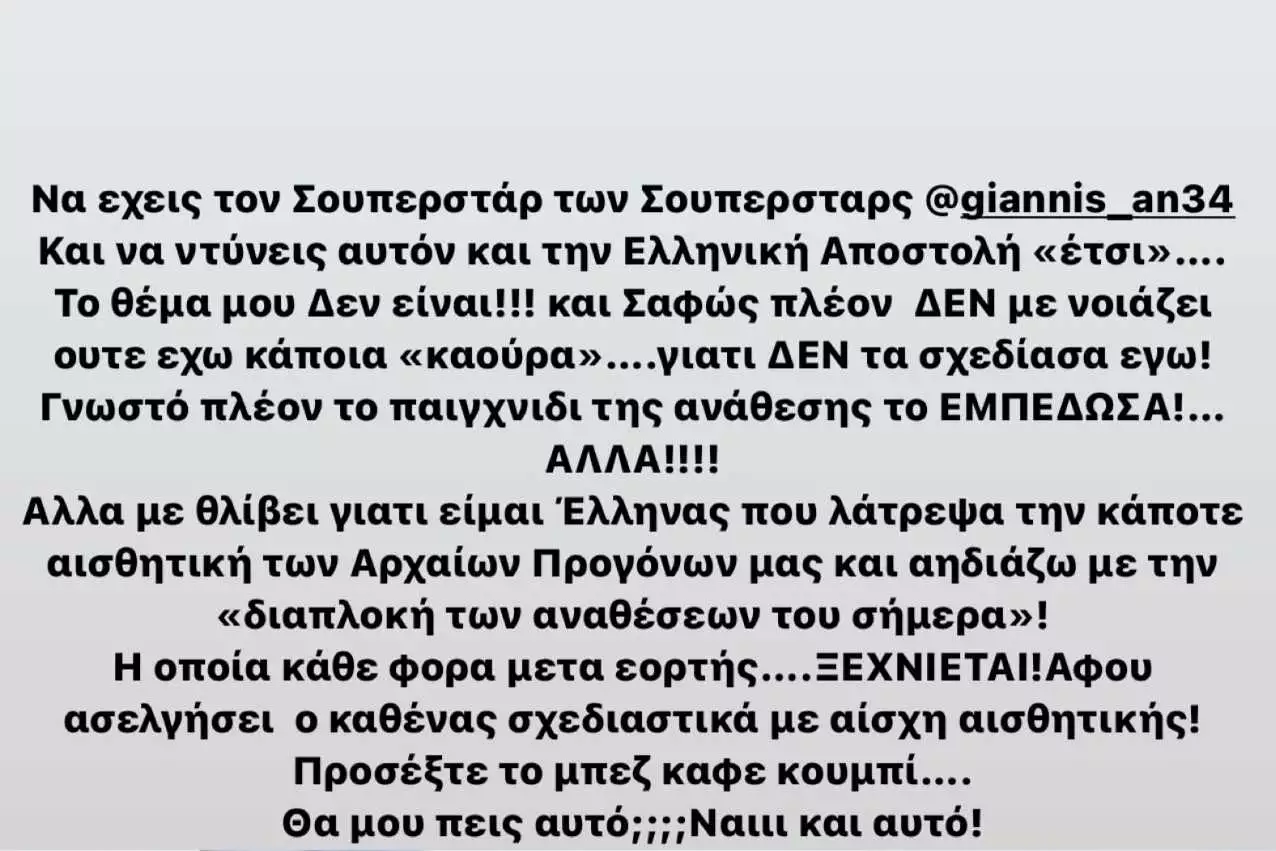 «Να έχεις τον σούπερ σταρ των σούπερ σταρς, Γιάννη Αντετοκούνμπο και να ντύνεις αυτόν και την Ελληνική Αποστολή “έτσι”…. Το θέμα μου Δεν είναι!!! Και Σαφώς πλέον ΔΕΝ με νοιάζει ούτε έχω κάποια “καούρα”…γιατί ΔΕΝ τα σχεδίασα εγώ! Γνωστό πλέον το παιγνίδι της ανάθεσης το ΕΜΠΕΔΩΣΑ!… ΑΛΛΑ!!!! Αλλά με θλίβει γιατί είμαι Έλληνας που λάτρεψα την κάποτε αισθητική των Αρχαίων Προγόνων μας και αηδιάζω με την “διαπλοκή των αναθέσεων του σήμερα”! Η οποία κάθε φορά μετά εορτής…. ΞΕΧΝΙΕΤΑΙ! Αφού ασελγήσει ο καθένας σχεδιαστικά με αίσχη αισθητικής! Προσέξτε το μπεζ καφέ κουμπί…. Θα μου πεις αυτό;;;; Ναιιι και αυτό!».