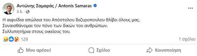 «Συναισθάνομαι τον πόνο των δικών του ανθρώπων», σημειώνει στο συλλυπητήριό μήνυμά του μέσω του Facebook ο Αντώνης Σαμαράς για τον χαμό του Απόστολου Βεσυρόπουλου.