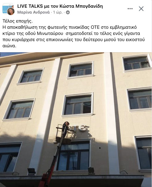 Η αποκαθήλωση της φωτεινής πινακίδας ΟΤΕ στο εμβληματικό κτίριο της οδού Μινωταύρου σηματοδοτεί το τέλος ενός γίγαντα που κυριάρχησε στις επικοινωνίες του δεύτερου μισού του εικοστού αιώνα.”