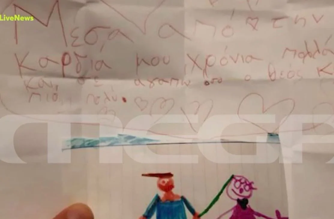 Το παιδί φαίνεται να έχει ζωγραφίσει τον πατέρα, ως αστυνομικό με την γαλάζια στολή, το πηλήκιο και από δίπλα την μητέρα. Ο πατέρας φαίνεται να κρατάει το περιβόητο γκλοπ, με το οποίο έχει περιγράψει και η μητέρα και τα παιδιά τον τρόπο με τον οποίο τους κακοποιούσε, ενώ και η ζωγραφιά δείχνε να χτυπάει την μητέρα με αυτό στο κεφάλι. Το ανήλικο εύχεται μέσω της ζωγραφιάς χρόνια πολλά στον πατέρα, απεικονίζοντας τον να χτυπά με το γκλοπ τη μητέρα στο κεφάλι.