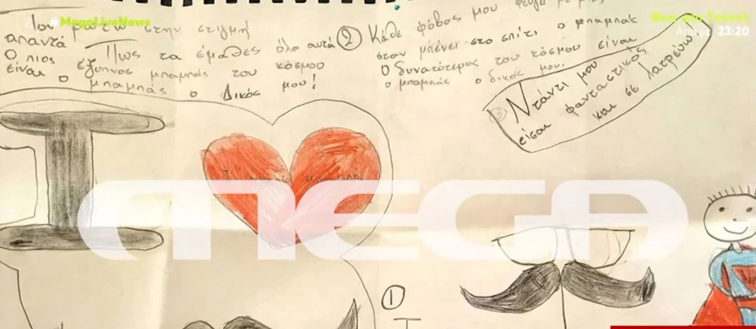 Στη δεύτερη ζωγραφιά βλέπουμε εκφράσεις όπως «ο πιο έξυπνος μπαμπάς του κόσμου», «κάθε φόβος μου φεύγει μόλις μπαίνει ο μπαμπάς στο σπίτι». Υπενθυμίζεται ότι τις ζωγραφιές τις έχει αναρτήσει ο ίδιος ο κατηγορούμενος, ενώ ο γραφικός χαρακτήρας δεν φαίνεται να είναι μικρού παιδιού, σύμφωνα με το Mega.