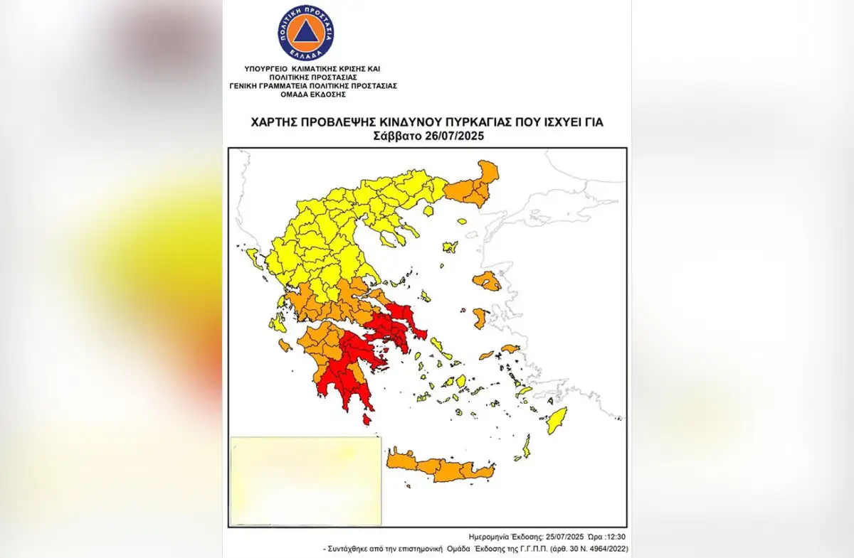 Από το πρωί του Σαββάτου (26.7.2025) και ενώ μαίνεται ο καύσωνας με θερμοκρασίες άνω των 40 βαθμών Κελσίου, έχουν ξεσπάσει δεκάδες φωτιές σε όλη τη χώρα, ενώ τα πιο σημαντικά μέτωπα είναι στα Κύθηρα, στη Μεσσηνία, στην Εύβοια και στις Αφίδνες.