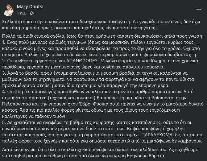 Τα Σωματεία τεχνικών στις ζωντανές οπτικοακουστικές εκδηλώσεις και το Θέατρο, εκφράζουμε τα συλλυπητήρια στην οικογένεια του συναδέλφου και δίνουμε υπόσχεση το περιστατικό να διαλευκανθεί και να αποδοθούν οι ευθύνες που αναλογούν.