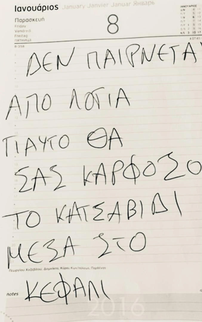 Στο φως της δημοσιότητας ήρθαν οι χειρόγραφες σημειώσεις του 51χρονου τραυμάτισε με κατσαβίδι επιβάτη λεωφορείου και στη συνέχεια εισέβαλε στο αστυνομικό τμήμα της περιοχής και τραυμάτισε με το ίδιο αντικείμενο τρεις αστυνομικούς στο Κορωπί.