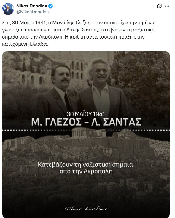 Ο υπουργός εθνικής Άμυνας, Νίκος Δένδιας, αναφέρθηκε στην ηρωική πράξη του Μανώλη Γλέζου και του Λάκη Σάντα πριν από 84 χρόνια, στις 30 Μαΐου 1941, να κατεβάσουν την ναζιστική σημαίας από την Ακρόπολη.