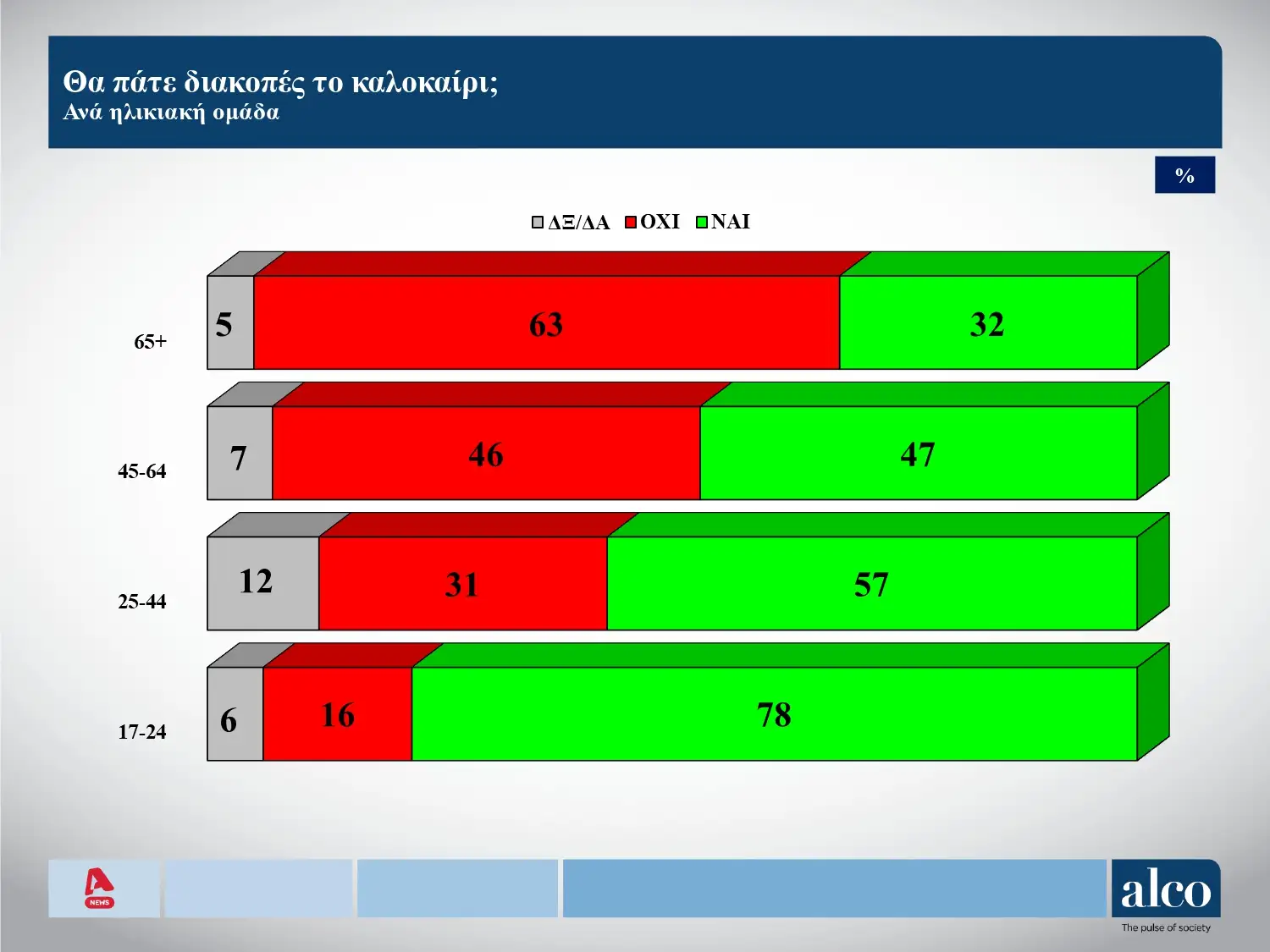 Σχεδόν οι μισοί Έλληνες δεν θα πάνε φέτος διακοπές σύμφωνα με τη δημοσκόπηση της Alco που παρουσιάστηκε στο κεντρικό δελτίο ειδήσεων του Alpha.