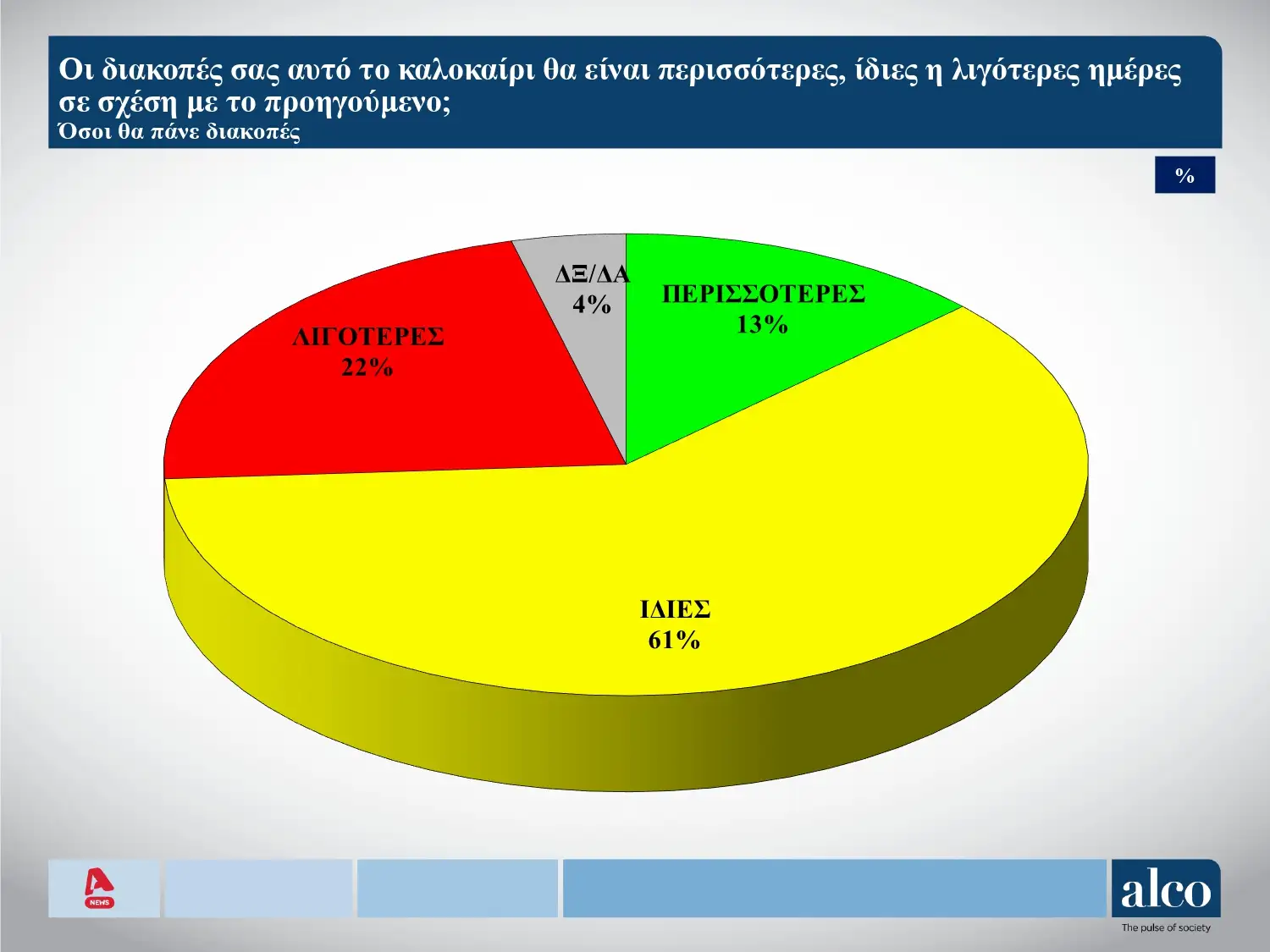 Όσο για το αν θα είναι περισσότερες ή λιγότερες οι φετινές διακοπές, το 61% ίδιες, 13% περισσότερες και 22% λιγότερες.