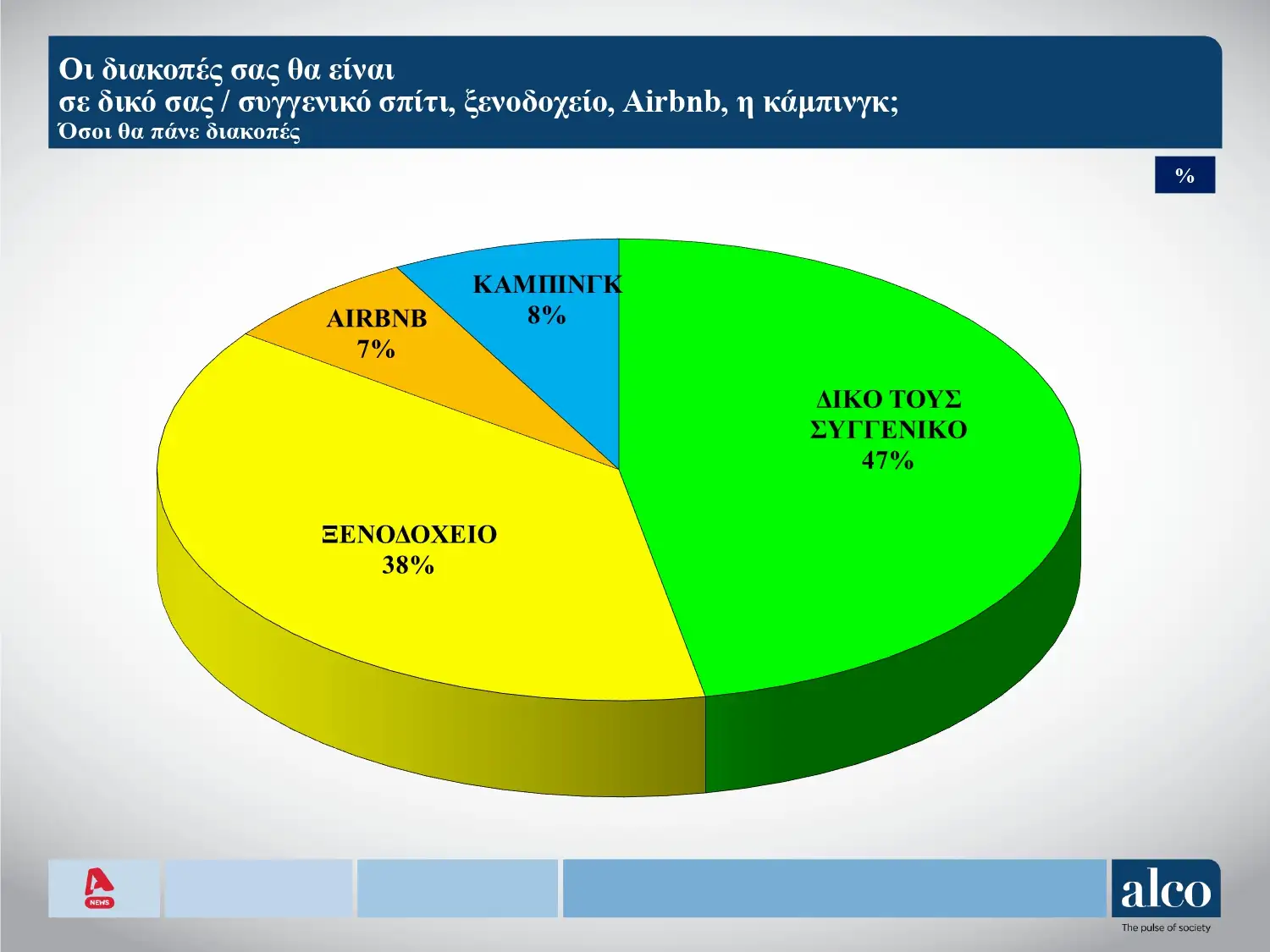 Αναφορικά με την διαμονή, οι ερωτηθέντες απάντησαν ότι θα μείνουν σε δικό τους ή συγγενικό σπίτι κατά 47%, σε ξενοδοχείο το 38%, σε κάμπινγκ το 8% και σε airnbn το 7%.
