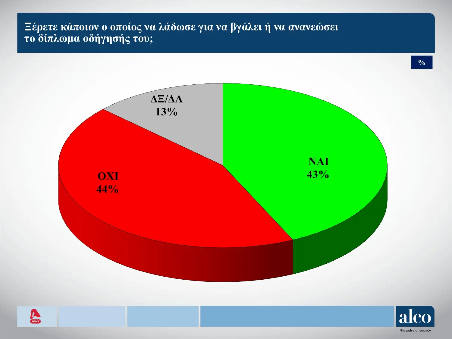 Σε ερώτημα για το αν γνωρίζουν κάποιον να έχει «λαδώσει» για το δίπλωμα οδήγησης το 43% λέει πως ξέρει και το 44% πως δεν γνωρίζει κάποιον.