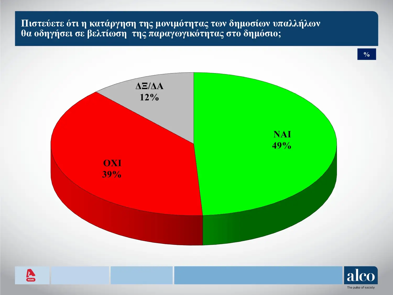 Για το αν κατάργηση της μονιμότητας στο Δημόσιο θα βελτιώσει την παραγωγικότητα, οι περισσότεροι (49%) δηλώνουν ναι, και όχι το 39%.