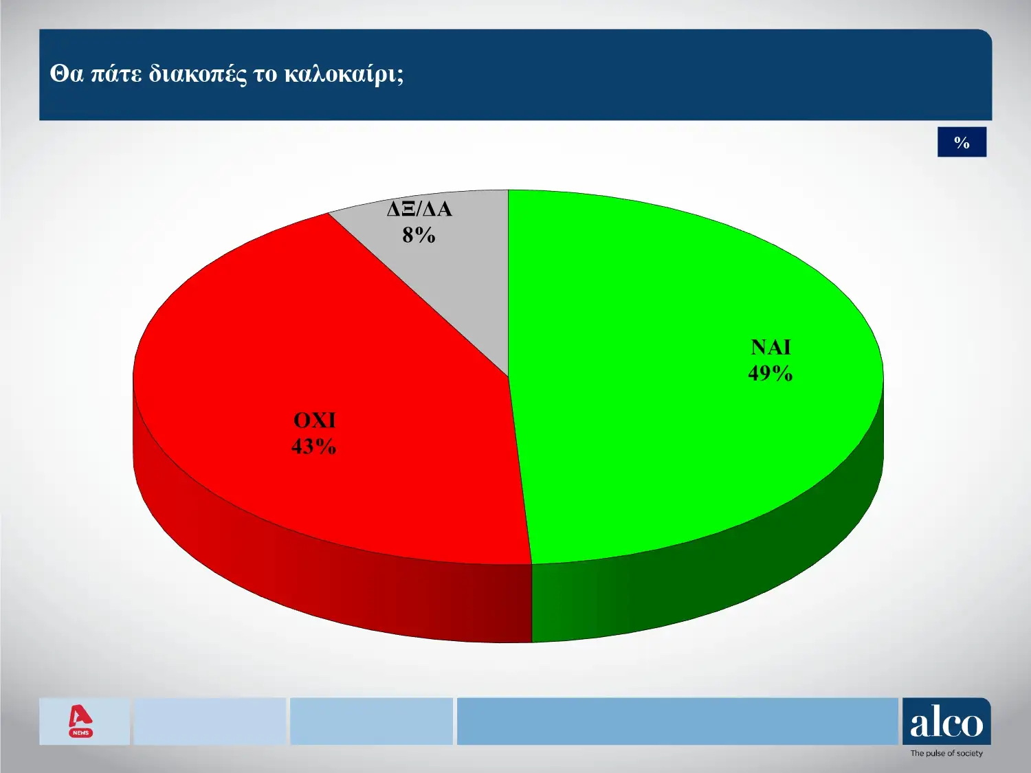 Ειδικότερα στο ερώτημα «Θα πάτε διακοπές φέτος» θετικά απάντησε το 49% και αρνητικά το 43%.