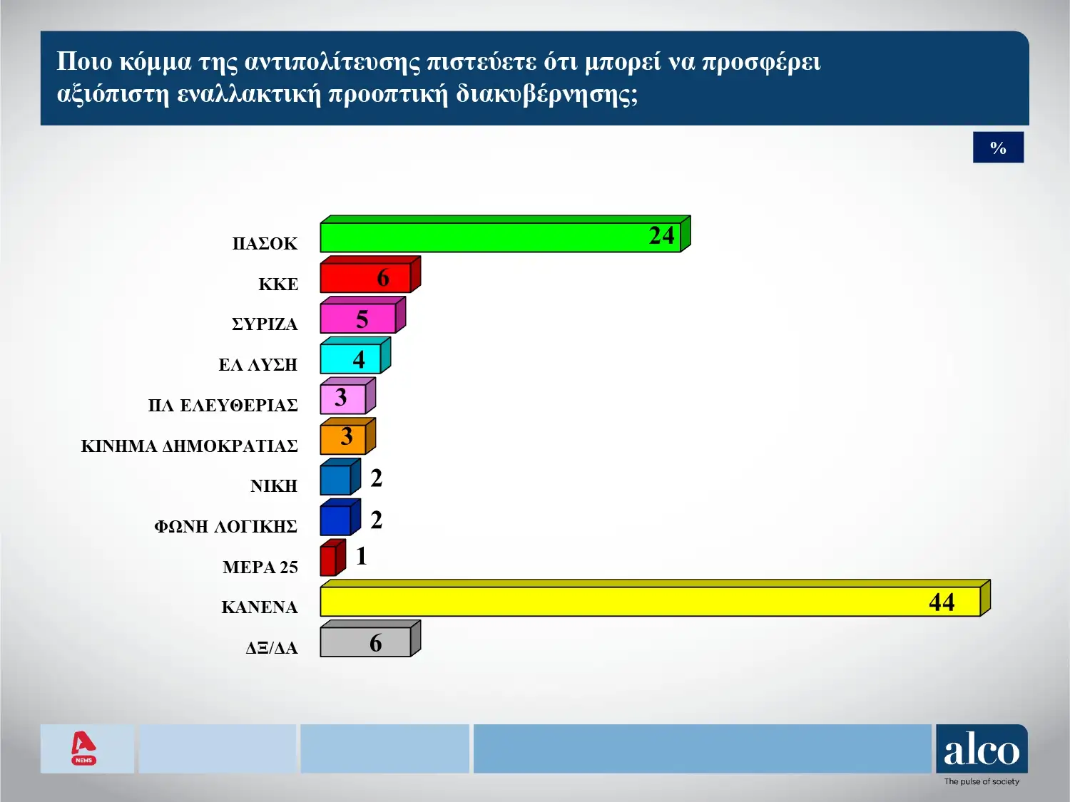 Στην ερώτηση ποιο κόμμα της αντιπολίτευσης αποτελεί την καλύτερη εναλλακτική τα ποσοστά είναι τα εξής: