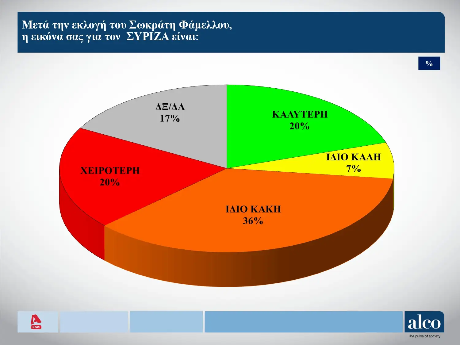 Όσον αφορά την εικόνα του ΣΥΡΙΖΑ μετά την εκλογή του Σωκράτη Φάμελλου το 36% λέει πως είναι ίδιο κακή, το 20% χειρότερη, το 20% καλύτερη και το 7% το ίδιο καλή.