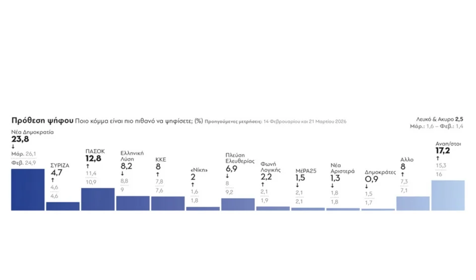Νέα ∆ηµοκρατία 23,8 (Μάρ. 26,1 Φεβ. 24,9)