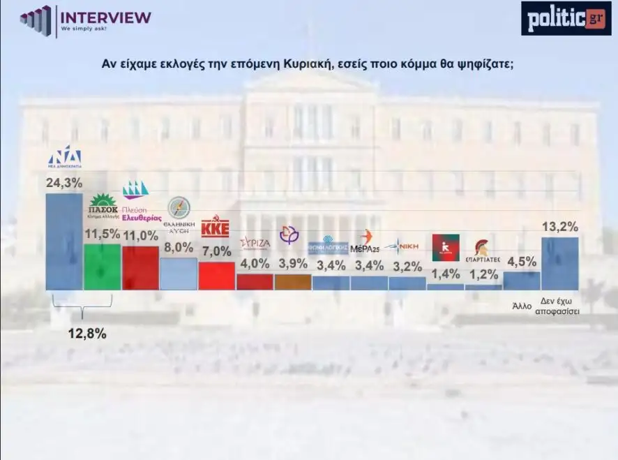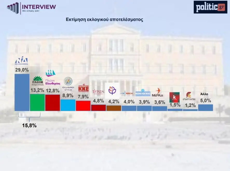 Ανάκαμψη της ΝΔ, επιστροφή του ΠΑΣΟΚ – ΚΙΝΑΛ στη δεύτερη θέση και υποχώρηση των ποσοστών της Πλεύσης Ελευθερίας καταγράφονται στη δημοσκόπηση της Interview για το politic.gr.