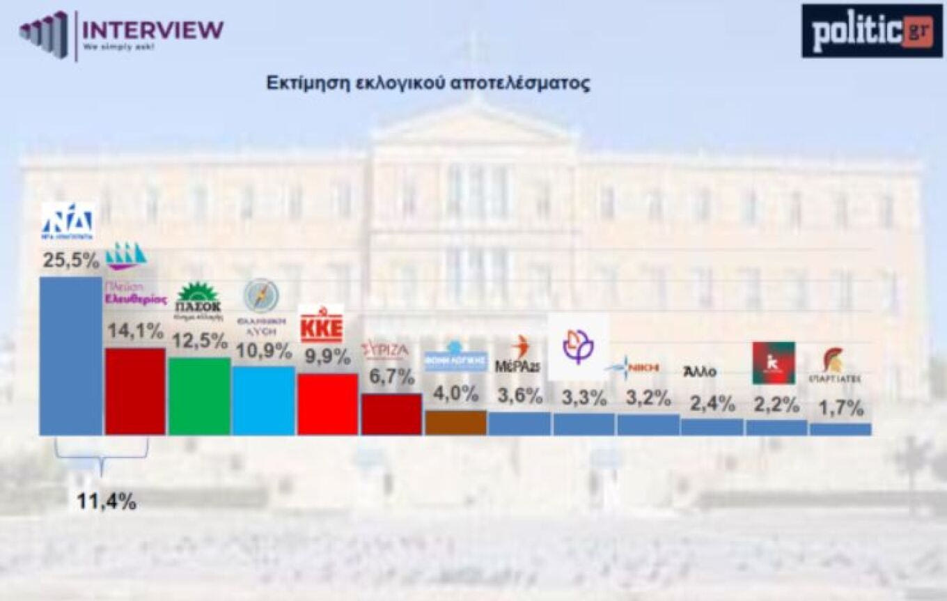 Πρωτιά της Νέας Δημοκρατίας με προβάδισμα 11,1% έναντι της δεύτερης Πλεύσης Ελευθερίας καταγράφει δημοσκόπηση της Interview για την ιστοσελίδα politic.gr.