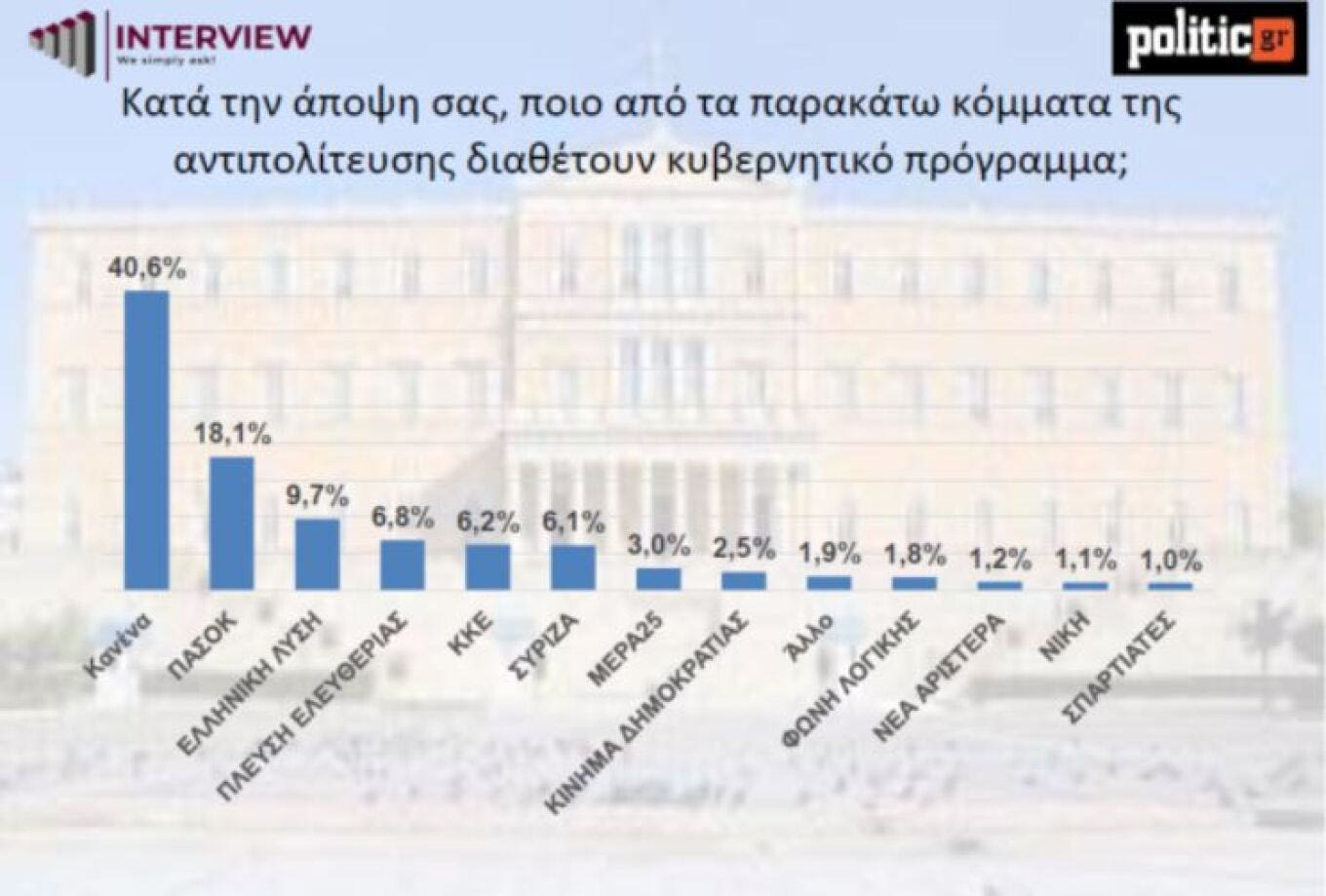 Στο ερώτημα ποιο κόμμα της αντιπολίτευσης διαθέτει κυβερνητικό πρόγραμμα, το 40,6% απαντά «κανένα» και ακολουθούν το ΠΑΣΟΚ με 18,1%, η Ελληνική Λύση με 9,7% και η Πλεύση Ελευθερίας με 6,8%.