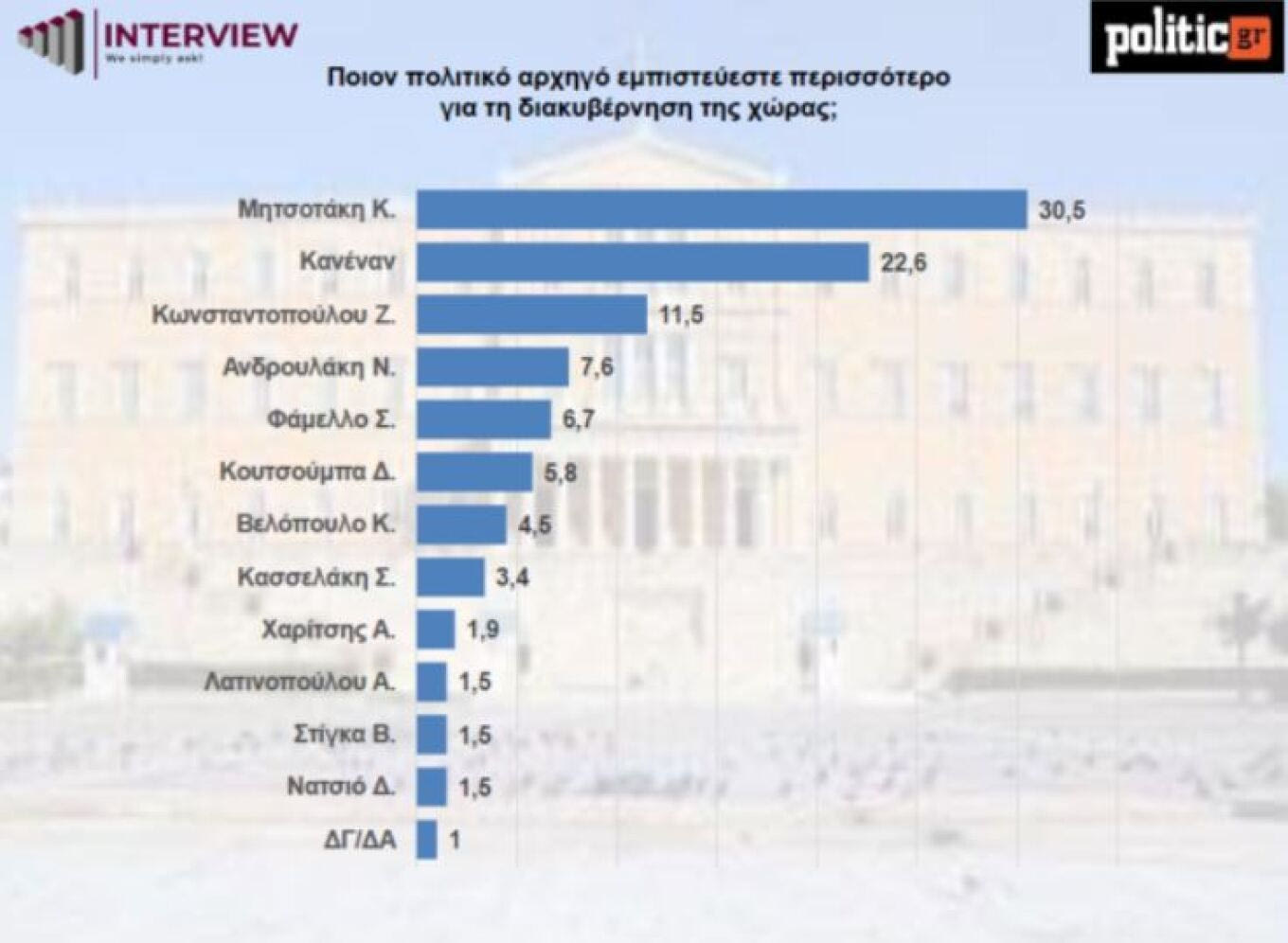 Παράλληλα ο Κυριάκος Μητσοτάκης επιλέγεται από το 30,5% ως ο πολιτικός αρχηγός τον οποίο εμπιστεύονται για τη διακυβέρνηση της χώρας, με δεύτερον τον κανένα με 22,6% και με μεγάλη απόσταση τρίτη τη Ζωή Κωνσταντοπούλου με 11,5% ενώ σε μονοψήφια ποσοστά είναι οι απαντήσεις για τον Νίκο Ανδρουλάκη (7,6%), τον Σωκράτη Φάμελλο (6,7%) και τον Δημήτρη Κουτσούμπα (5,8%).