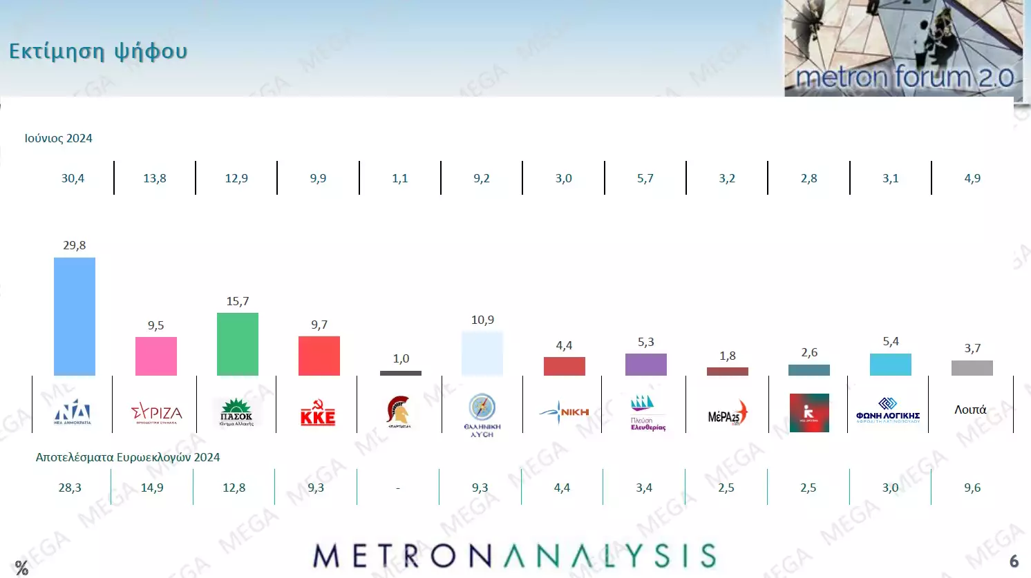 Συγκεκριμένα, στην εκτίμηση ψήφου, η ΝΔ συγκεντρώνει ποσοστό 29,8%, το ΠΑΣΟΚ 12,9% ενώ ο ΣΥΡΙΖΑ 6,5% χάνοντας 4,3 μονάδες από τον Ιούνιο του 2024.