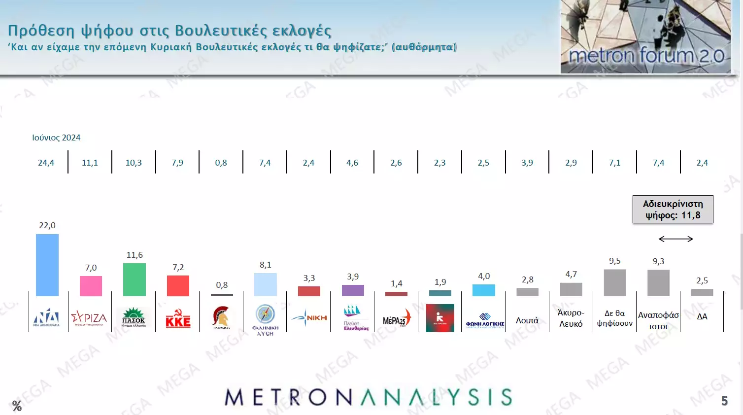 Στην πρόθεση ψήφου, η ΝΔ συγκεντρώνει το 22% το ΠΑΣΟΚ το 11,6% η Ελληνική Λύση το 8,1% το ΚΚΕ το 7,2% και ο ΣΥΡΙΖΑ το 7% είναι δηλαδή 5ο κόμμα…