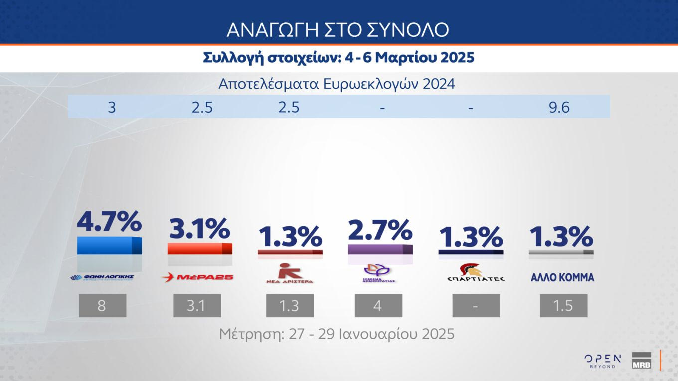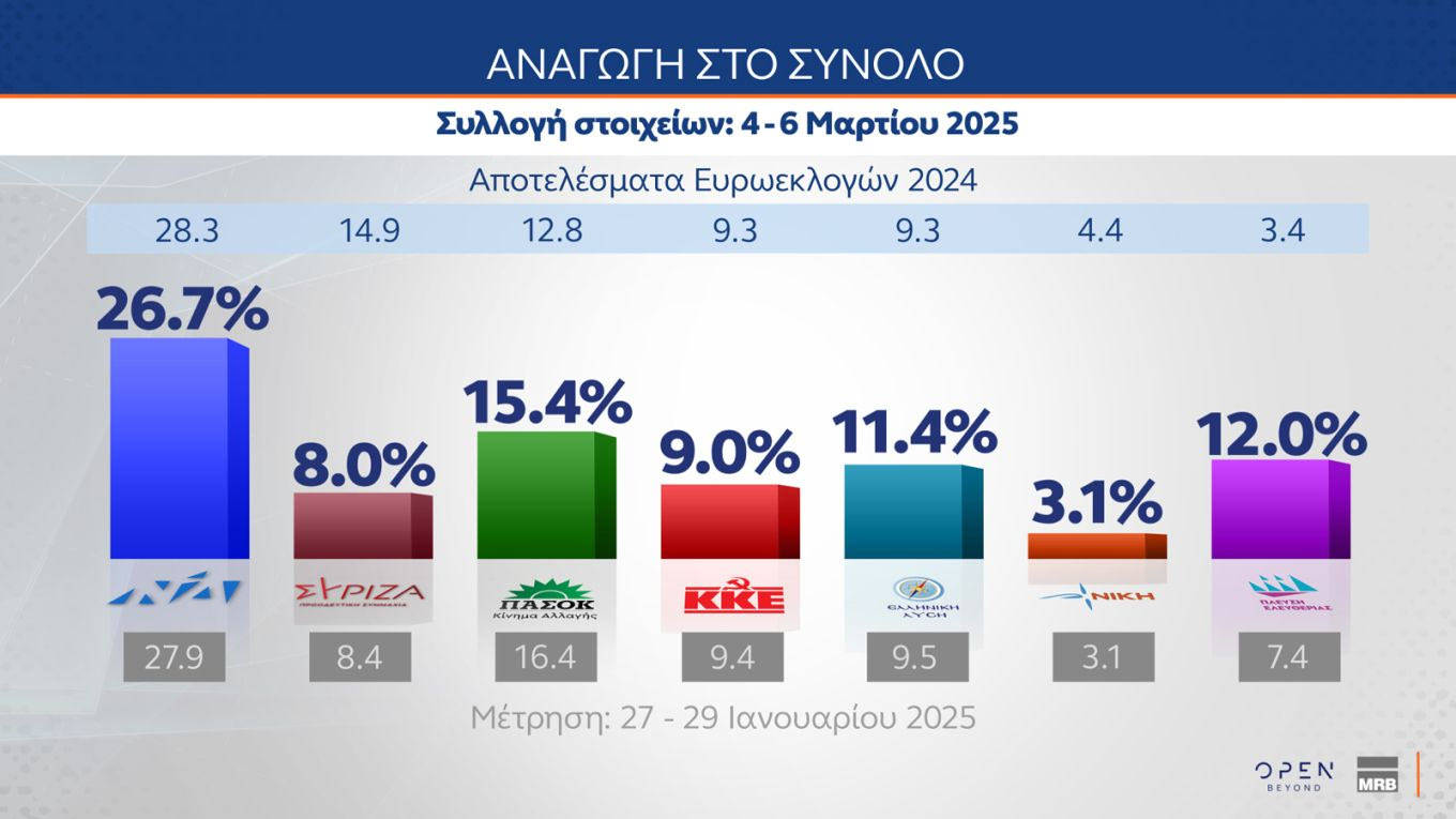 Η Νέα Δημοκρατία διατηρεί το προβάδισμά της έναντι του ΠΑΣΟΚ σε νέα δημοσκόπηση της MRB για την τηλεόραση του OPEN. Στην τρίτη θέση είναι η Πλεύση Ελευθερίας και ακολουθεί η Ελληνική Λύση.