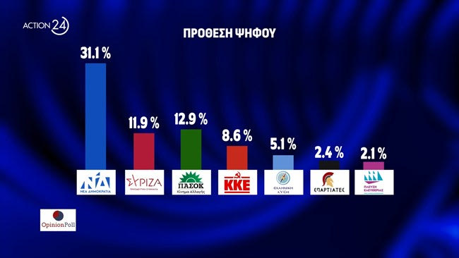 Η δημοσκόπηση της Opinion Poll που έγινε για λογαριασμό του Action 24 αποτελεί την πρώτη πανελλαδική δημοσκόπησης μετά από τις τελευταίες εξελίξεις στο κόμμα της Αξιωματικής Αντιπολίτευσης και την αποχώρηση της «Ομπρέλας» κατά τη διάρκεια συνεδρίασης της Κεντρικής Επιτροπής.