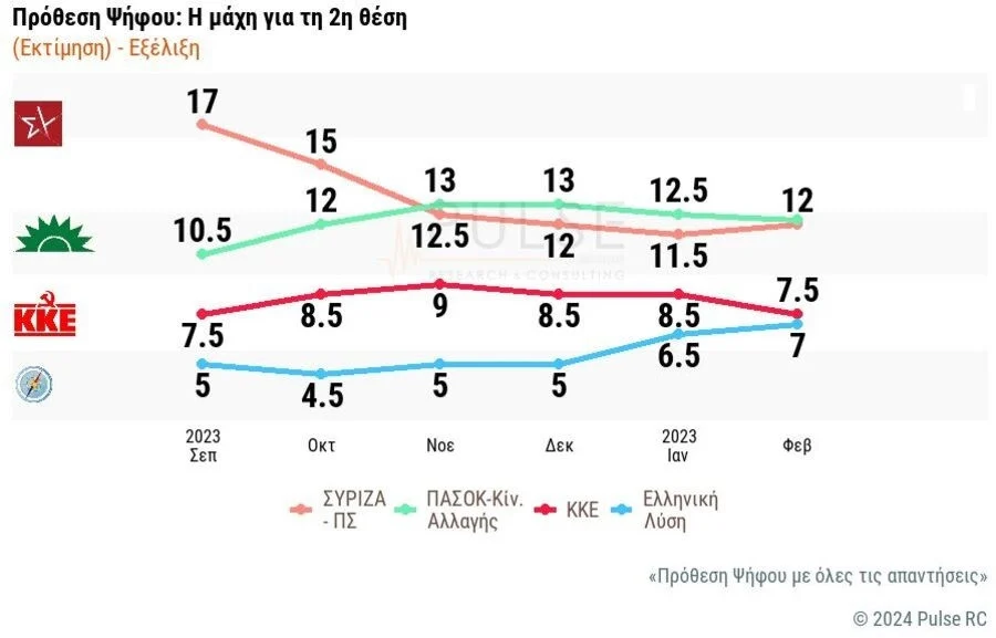 Στο παραπάνω γράφημα απεικονίζεται η μάχη μεταξύ ΣΥΡΙΖΑ και ΠΑΣΟΚ για τη δεύτερη θέση, σύμφωνα με τις δημοσκοπήσεις της Pulse από τον Σεπτέμβριο του 2023 και μετά.