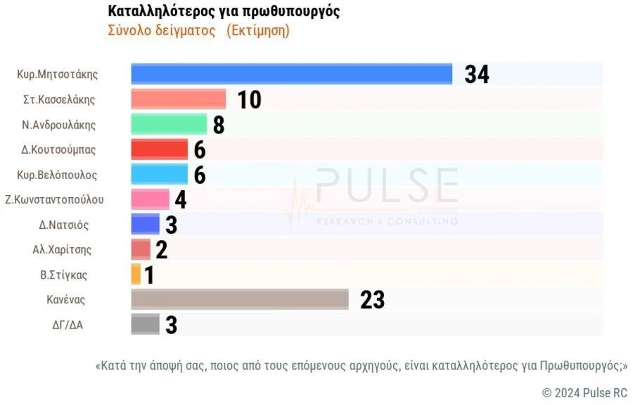 Στην καταλληλότητα για την πρωθυπουργία ο Κυριάκος Μητσοτάκης βρίσκεται στην πρώτη θέση με 34%. Ο Στέφανος Κασσελάκης ακολουθεί στην δεύτερη θέση με 10%. Ο Νίκος Ανδρουλάκης λαμβάνει το 8%. Ο Δημήτρης Κουτσούμπας και ο Κυριάκος Βελόπουλος συγκεντρώνουν από 6%.