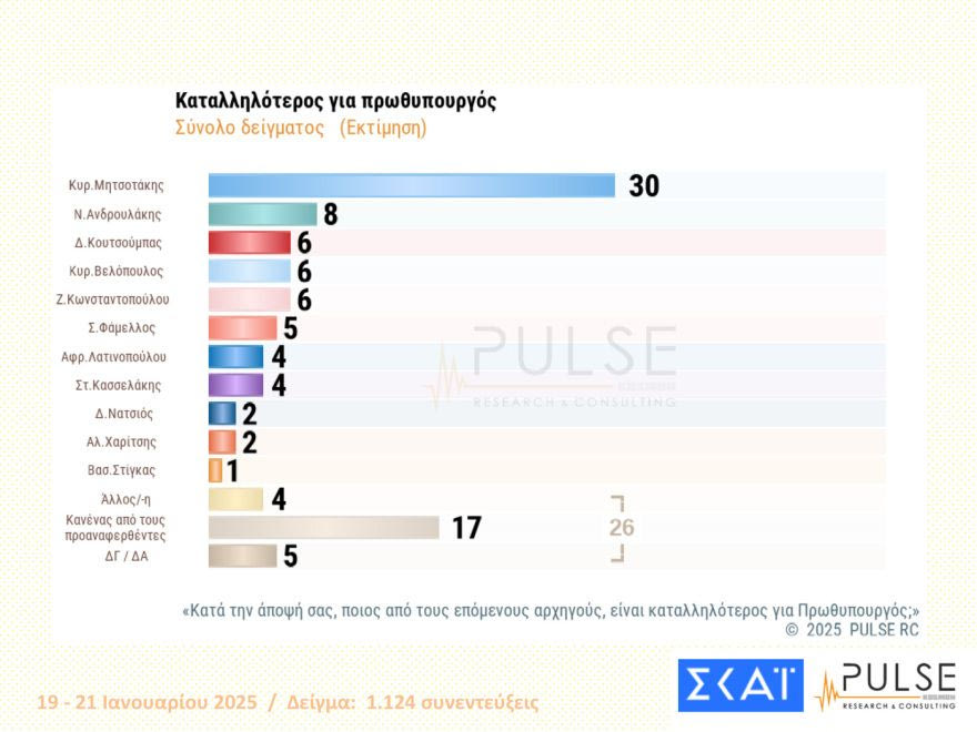 Ελαφρά άνοδο της Νέας Δημοκρατίας, πτώση κατά μία μονάδα του ΠΑΣΟΚ και ενδυνάμωση της Ελληνικής Λύσης και της Φωνής Λογικής στον απόηχο της επανεκλογής Τραμπ, κατέγραψε η μέτρηση της Pulse, που παρουσιάστηκε απόψε στο κεντρικό δελτίο του ΣΚΑΪ. Ο Κυριάκος Μητσοτάκης εξακολουθεί να κυριαρχεί χωρίς αντίπαλο στο ερώτημα για τον καταλληλότερο πρωθυπουργό, καθώς συγκεντρώνει 30% – όσο και το κόμμα του – ενώ ο Νίκος Ανδρουλάκης μένει στο 8%, δηλαδή στο 50% της ψήφου στο ΠΑΣΟΚ.