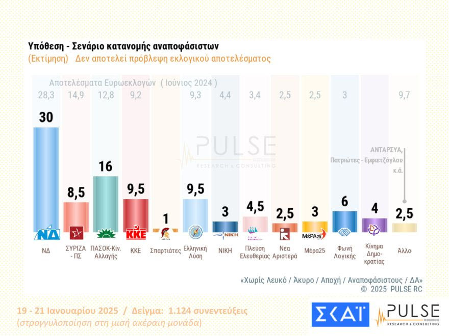 H μέτρηση δείχνει τον ΣΥΡΙΖΑ στην 5η θέση με άνοδο μισής μονάδας, πίσω από από το ΚΚΕ που μένει σταθερό στο 9,5% στην εκτίμηση ψήφου και την Ελληνική Λύση που κερδίζει μισή μονάδα και φτάνει επίσης στο 9,5%. Η Pulse «βγάζει» και πάλι δεκακομματική Βουλή, με τους Σπαρτιάτες και τη Νέα Αριστερά να μένουν εκτός, αλλά να περνούν τον πήχη η Φωνή Λογικής με 6%, η Πλεύση Ελευθερίας με 4,5%, το κόμμα Κασσελάκη με 4%, όπως και η Νίκη και το ΜεΡΑ25 με 3%. Σημειώνεται ότι στην πρόθεση ψήφου καταγράφεται «γκρίζα ζώνη» 15,5% – πράγμα που υποδηλώνει ότι δεν υπάρχει εκλογική ψυχολογία στους πολίτες.