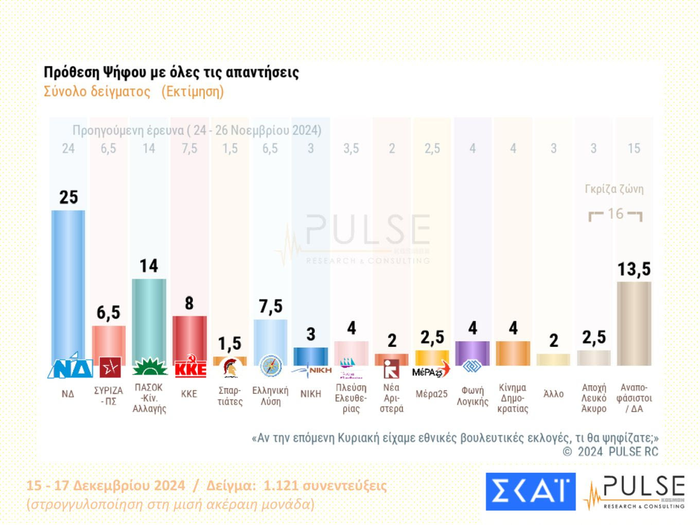 Η μέτρηση δίνει την εικόνα μίας Βουλής εννέα κομμάτων – με τη Νέα Αριστερά και το ΜεΡΑ25 να μένουν εκτός και σε αυτή την δημοσκόπηση. Τα ποσοστά του ΠΑΣΟΚ και του ΣΥΡΙΖΑ δεν παρουσιάζουν διαφοροποίηση σε σχέση με την προηγούμενη δημοσκόπηση της Pulse, ενώ κέρδη εμφανίζουν το ΚΚΕ και η Ελληνική Λύση.