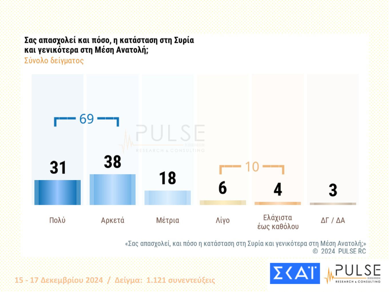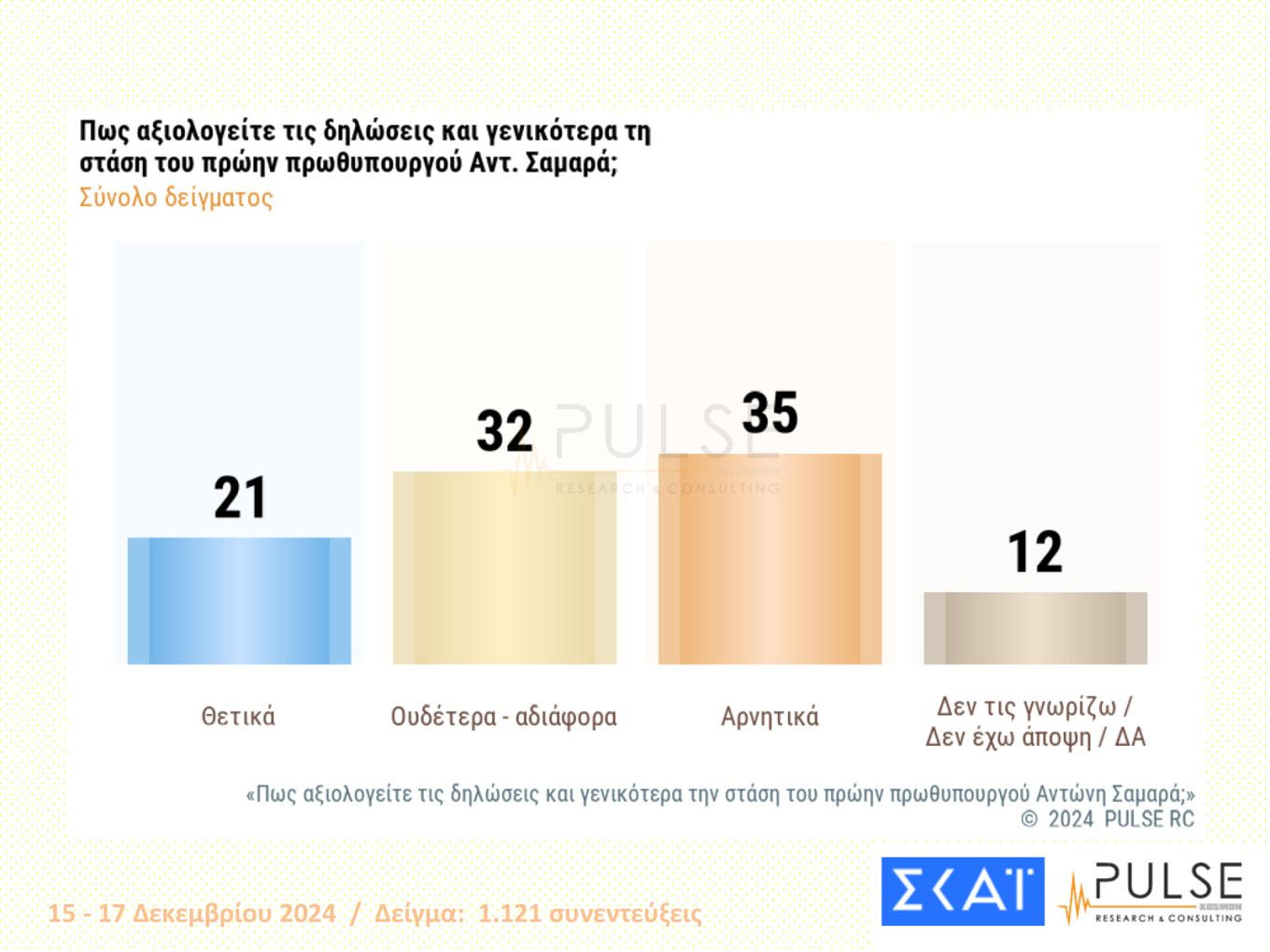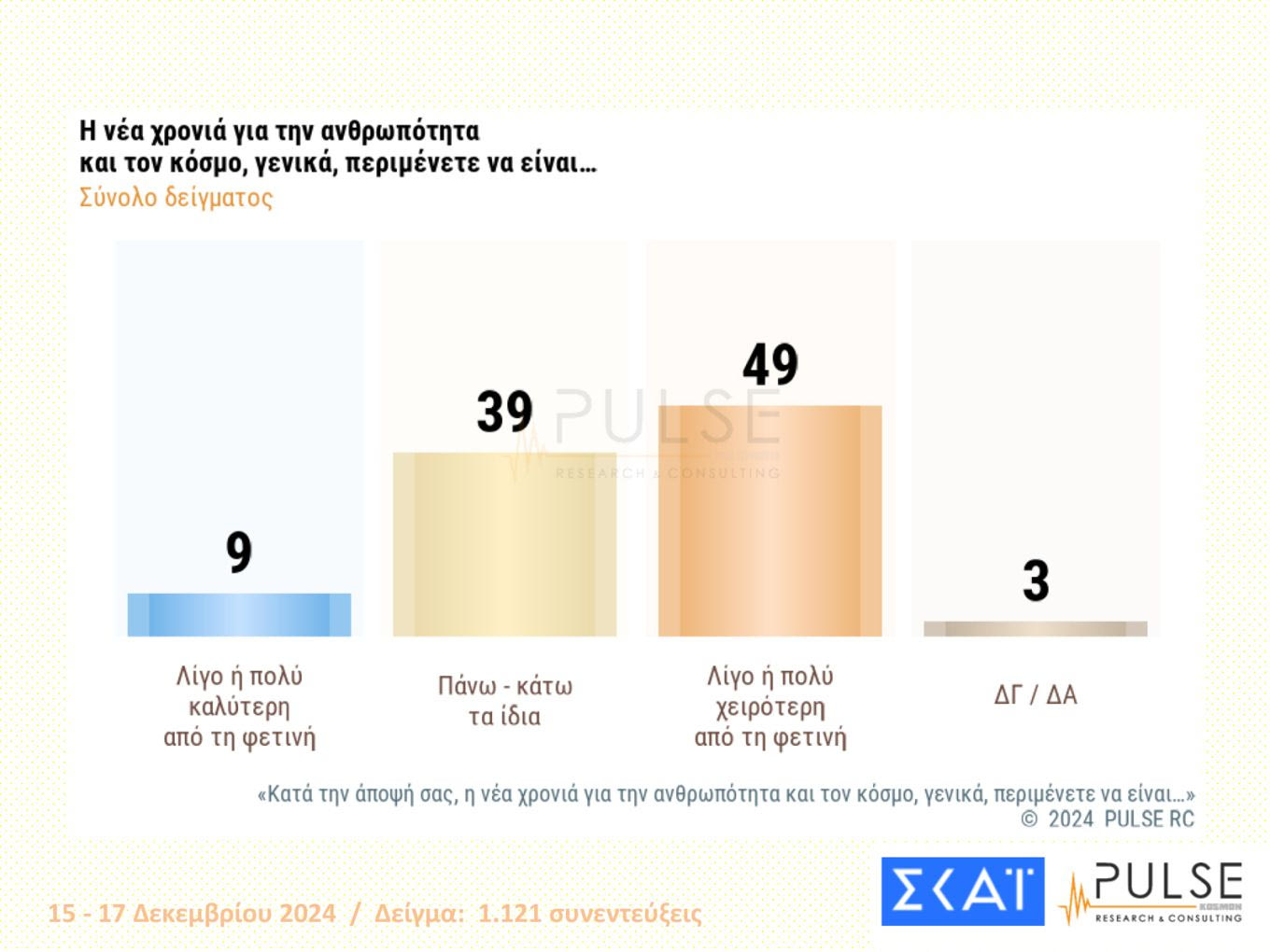 Στο σύνολο του δείγματος καταγράφεται ένας μεγάλος βαθμός απαισιοδοξίας για την επόμενη χρονιά – είναι χαρακτηριστικό ότι ένας στους δύο δηλώνει ότι περιμένει το 2025 να είναι λίγο ή πολύ χειρότερο. Σημαντικό ενδιαφέρον δηλώνουν οι πολίτες για τα ελληνοτουρκικά, όπως και τα όσα συμβαίνουν στη Μέση Ανατολή, ενώ ένας στους πέντε αξιολογεί θετικά τις δηλώσεις και τη στάση του Αντώνη Σαμαρά.