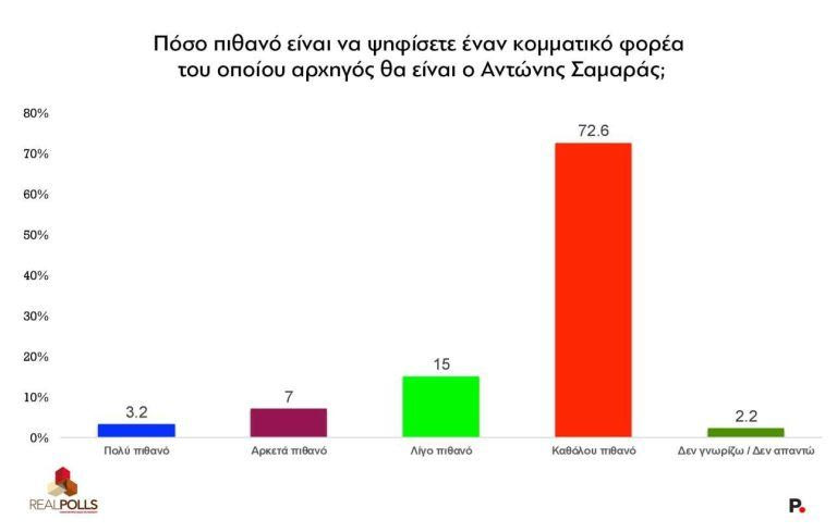Πιο απογοητευτικά είναι τα ευρήματα της έρευνας για τον Αντώνη Σαμαρά (Πίνακας IV). Στη σχετική ερώτηση, μόλις το 3,2% δήλωσε ότι είναι «πολύ πιθανό» να ψηφίσει ένα κόμμα υπό τον κ. Σαμαρά και άλλο ένα 7% ότι είναι «αρκετά πιθανό». Το 72,6% των ερωτηθέντων απάντησαν ότι δεν είναι καθόλου πιθανό να τον ψηφίσουν.