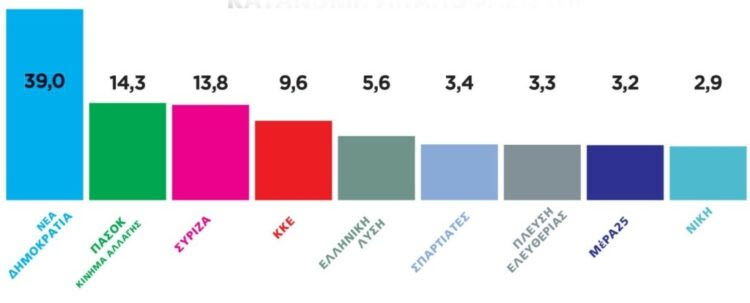Το ΚΚΕ είναι τέταρτο με 9,6%, ακολουθεί η Ελληνική Λύση με 5,6%, οι Σπαρτιάτες με 3,4%, η Πλεύση Ελευθερίας με 3,3%, το ΜέΡΑ25 με 3,2% και η Νίκη με 2,9%.